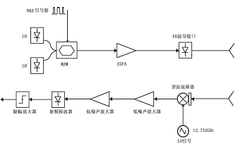 太赫茲頻段由於其寬帶特性,在通信、雷(léi)達、特征頻譜檢測等領域具有巨大應(yīng)用潛力。為了使短距(jù)離無(wú)線通信(xìn)的數據速率達到10Gbps,利用光電結合技術以THz波段(125GHz)為載波,建(jiàn)立太赫茲無線通(tōng)信係(xì)統。如(rú)下圖所示使(shǐ)用62.5GHz信號(hào)調製(zhì)光波,通過平麵分波電(diàn)路產(chǎn)生相(xiàng)隔0.125THz光信號,此(cǐ)光信號受發射數據的調(diào)製,然後進入(rù)PD,進行光電轉換,產生0.125TH組的調製波,經過放大後饋入天線發射,接收(shōu)端經天線後進入低噪放,檢波成基帶信號,經過放(fàng)大,數據恢複。