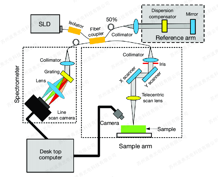 如下(xià)圖,常用的SD-OCT係統,基於超輻射發光二極管寬帶光源(SLD光源),光學器件(隔離器,耦合器,準直(zhí)器,反(fǎn)射鏡,光柵),掃描振鏡(一維、二(èr)維掃描振鏡),高速掃描相機(線陣相機、麵陣相(xiàng)機),OCT光譜儀,圖像采集卡,數據(jù)處理係統等組成。