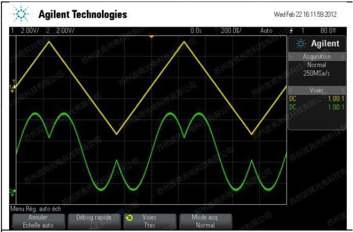 下圖中黃色的曲線是鋸齒波射頻的(de)電信號(10Vpp)作用於電光強度調製(zhì)器(qì)MX-LN-10調製器射(shè)頻接口上。綠色曲線是強(qiáng)度調整器輸出的光強,通過測量p相移所(suǒ)需的(de)電壓,VpRF=4.8V@1540nm。使用(yòng)不同頻率(lǜ)的射頻電信號(hào),我們可以測得對(duì)應頻率下(xià)的VpRF。但是這種測(cè)量方法,並且隨著頻率的升高,所(suǒ)需的高頻設備也(yě)會變得非常昂貴。