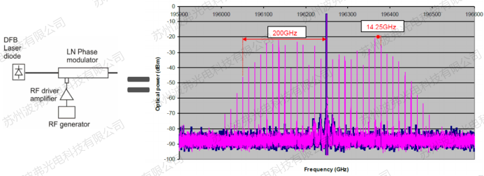 舉例如下圖(tú),射頻信號頻率(lǜ)為(wéi)14.25GHz, 根據驅動(dòng)電壓強度大小,可以產生10多階邊帶(dài),將載波光譜展寬至400GHz數量級。