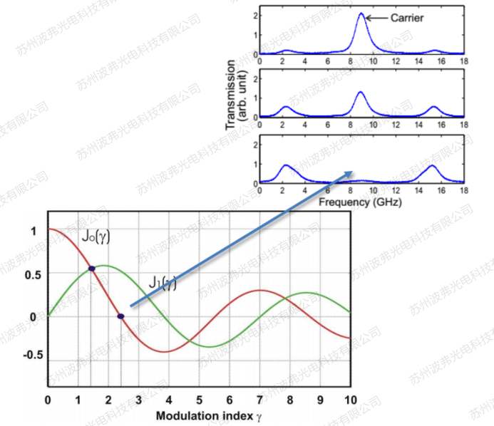 連續激光經過相位調製器後,通過光譜儀測量的結果是載(zǎi)波和多階邊帶的頻率,其頻(pín)譜(pǔ)強度服從(cóng)貝塞爾函數: