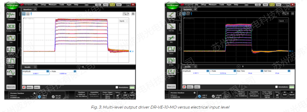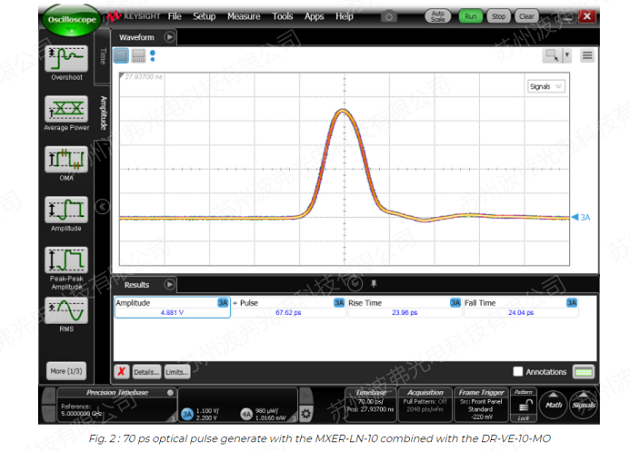 使用AWG,第(dì)一調製塊AM1用(yòng)於產生超短(duǎn)光脈衝(chōng)。采(cǎi)用iXblueNIR-MX800、MXER1300和MXER高(gāo)對(duì)比度寬帶(dài)幅度調製器,分別(bié)在850nm、1310nm和1550nm處獲得70ps的超短光脈衝。調製器與驅動器DR-VE-10-MO相結合,DR-VE-10-MO可被設置為方(fāng)形或(huò)高斯脈衝,限幅或線性放(fàng)大器。采用iXblue偏壓控製器MBC-DG-LAB,在高達數GHz的(de)脈衝重頻下,獲得了較高的脈衝消(xiāo)光比穩定性。