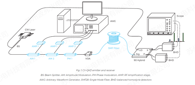 下圖給出了連續變量QKD(CVQKD)的一(yī)個實例。信息被編碼在激光脈衝的振幅和相位中(zhōng),使(shǐ)用iXblue解決方案:兩個強度調製器(qì)AM1和AM2與相位調製器PM1級聯(lián)。