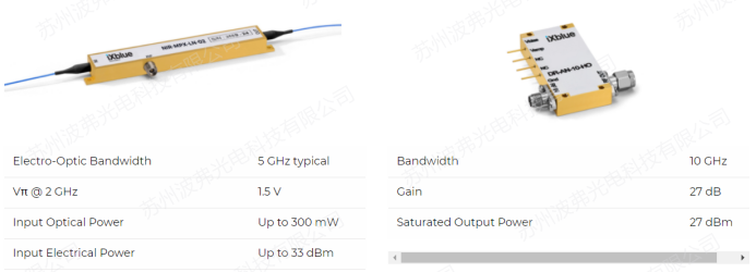 iXblue研製了NIR-MPX-LN-02及其配套的高(gāo)壓射頻放大器DR-AN-10-HO,NIR-MPX-LN-02滿足SBC激光係統(tǒng)的所有要求,這種相位調製器具有超(chāo)過5GHz的帶寬,1.5V的極低(dī)半波電壓,超過33dBm的射頻承受功率和300mw的光(guāng)承受(shòu)功率。