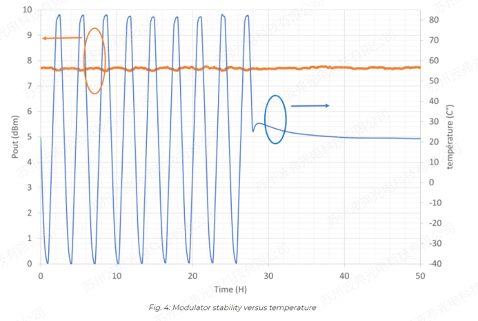 由於(yú)激光係統可能需要在戶外和(hé)具有挑戰(zhàn)性的環境中工作,因此對調製器進行了長時間溫度循(xún)環測(cè)試。溫度(dù)(藍色(sè)曲(qǔ)線)從-40°C到+85°C,並記(jì)錄輸出功率(橙色曲線)。通過我們的特殊調製器工藝,調製器是非常穩定的,我們隻觀察到(dào)在整個溫度範圍內0,2dB的微小變化。