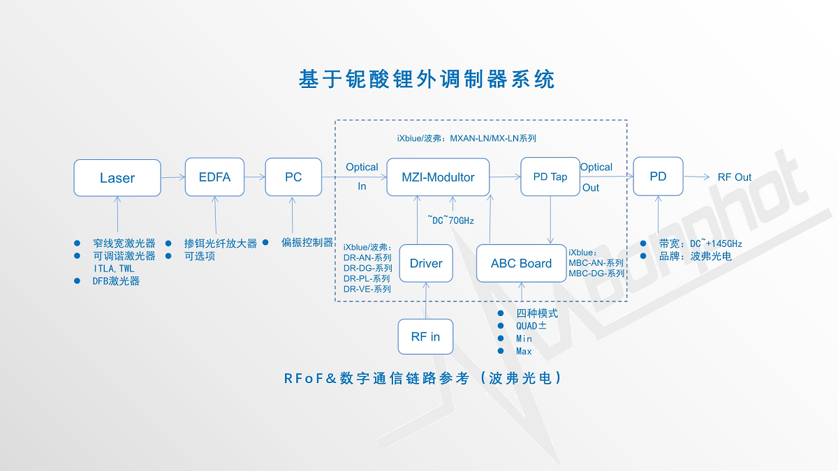 目前市麵上RFoF係統,有直接調製激光器(Directly modulated lasers)、電吸收調製器(Electro-absorption modulator)、铌酸鋰外調(diào)製器(Lithium Niobate Mach-Zehnder Modulator)設計方式,相對於直接調製、電吸收調製器較容易收到帶寬、消光比性能限製,铌酸鋰外(wài)調製器方(fāng)式具有無可比擬的高帶寬、低插損、高線性等優勢。