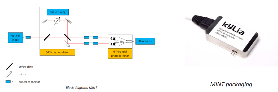 當對傳輸(shū)速率的需求高於Gbit/s時,必須(xū)開發新(xīn)的調製和解調技術。基於自由空間設計和長期的(de)電信技術背景,iXblue能夠為這(zhè)種複雜的解調提供各種產(chǎn)品。其中一係(xì)列產品(iXblue MICS係列,請聯係我們提供更多資料)致力於多路複用和解複用(yòng),這意味著能夠在一根獨特的(de)光(guāng)纖中傳輸許多不同波(bō)長的激光(即40路不同波長的激光束在一根典型的電信(xìn)光纖中傳輸,1528至1560 nm,C波段,)。另一係列產品(iXblue MINT係列,見下圖)使(shǐ)用光的另一個特性進行解調,即電磁波的相位,相位(0或π)的調製比強度的調製更容易、更快。MINT產品使光(guāng)學DPSK(差分相移鍵控)解調成為可能,它適用於大約10 Gbit/s的更高傳輸速(sù)率。i