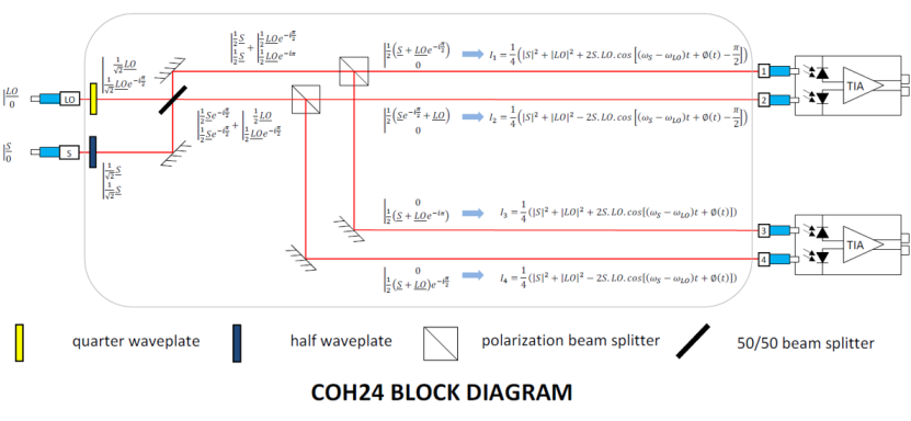 隨(suí)後產生了“QAM”技術(shù),這是一種使(shǐ)用電磁波相位和強度的調製技(jì)術。除了前麵的優點之外,該解決方(fāng)案允許使用中間值(zhí)(0和1之間,0和π之間)進行調(diào)製。它為信息編碼提供了更多的(de)可(kě)能性(xìng)。例如,QAM16和QAM64技術可以在單位(wèi)比特時間內處理(lǐ)4到6比特。這種信號的解調(diào)非常(cháng)複雜,可以通過iXblue 90°光學混頻方案(iXblue COH係列,見下圖)實現。信號光的相位、振幅甚至(zhì)偏振態,通過信號(hào)光和本振光(特定頻率的參考光)之間執行四次90°相(xiàng)位幹涉。