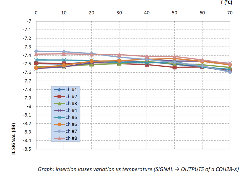 感謝最初(chū)為(wéi)電信行業開發的環(huán)氧樹脂技術,iXblue器(qì)件可以提(tí)供(gòng)穩定、堅固的特性。下(xià)圖為COH光混頻器優異的溫(wēn)度性能,插損隨溫度的變化極小,滿足苛刻環境(jìng)下的應用要求。