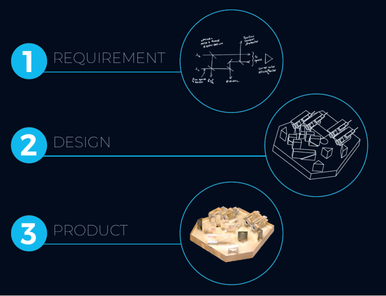 iXblue能夠將實驗裝置集成為工業級的光學模塊(kuài),從客戶要求(簡易的(de)草圖,下圖步驟1)開始,iXblue可以領導或參與(yǔ)完整的產品開發步驟:設計(下圖步驟2)、原型(xíng)機到批量生產(下圖步驟3),iXblue的專業技術在(zài)於將微光(guāng)學元件超精確地組裝在玻璃基(jī)板上,在滿(mǎn)足光學性能要求的前提下提供更小的體積,優異的可靠性和穩定性。
