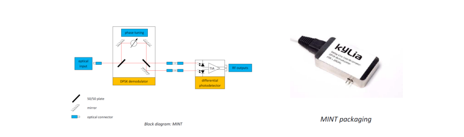 當(dāng)對傳輸速率的需求高於Gbit/s時,必須開(kāi)發新的調製和解調技術。基於自由空間設計和長期的(de)電信技術背景,iXblue能夠為這種複雜的解(jiě)調提供各種產品。其中(zhōng)一係列產(chǎn)品(iXblue MICS係列(超鏈接),請聯係我們提供更多資(zī)料)致力於多路複用和解複用,這意味著能夠在一根獨特的光纖中傳輸許多不同波長的激光(即40路不同波長的激光束在一根典型的電信光纖中傳輸,1528至(zhì)1560 nm,C波段,)。另一係列產品(iXblue MINT係列,見(jiàn)下圖)使用光的另(lìng)一個特性進行解調,即電磁波的相位,相位(0或(huò)π)的調(diào)製(zhì)比強度的調製更容易、更快。MINT產品使光學DPSK(差分相移鍵控)解調成為可能,它適用於大約10 Gbit/s的更高(gāo)傳輸速率。(MINT:延遲線幹涉儀,DPSK解調器)