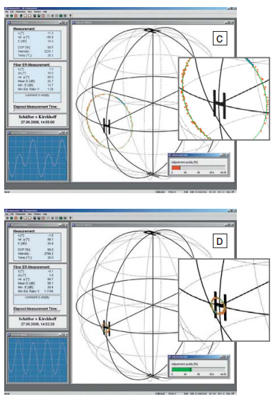 在偏振分析儀的光纖對準(zhǔn)過程中,使用圓半徑和偏振對(duì)準之間的對應關係。該過程從記錄出口(kǒu)偏振狀態開始,同時改變溫度,或(huò)小心彎曲光纖,以引起出口偏振波(bō)動。然後在數據點上自動擬合一個圓,並(bìng)顯示平均值和最小PER。在大半徑(jìng)範圍內。在連續測量出(chū)口偏振狀(zhuàng)態的過程中(zhōng),光纖軸將相對於激光源的偏(piān)振軸旋轉。當出口偏振態盡可能接近龐加(jiā)萊球上的圓心時,達到最佳對準。