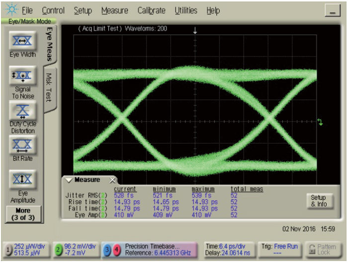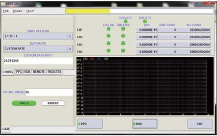 PPG-250C-x-4CH 與 EDR-250C-4CH 是高效 25Gb/s x 4ch TOSA/ROSA,100GbE應用, 高速 ICs ,光(guāng)電二極(jí)管生產線速率傳輸係統性能(néng)測試,通信實(shí)驗室數據鏈路測試的解決方案。PPG-250C-x-4CH 和 EDR-250C-4CH具有4通道同時測試誤碼率的能(néng)力。此(cǐ)外,還具有設備檢查時4通道可調傾斜功能。 PPG-250C-x-4CH內置超穩定、低抖動(dòng)時鍾,EDR-250C-4CH帶有正(zhèng)恢複時鍾 (CDR) 使其非常適合(hé)光纖鏈路測試。這些單元可通過USB,GPIB端口程控(kòng),可以實現自動測試。