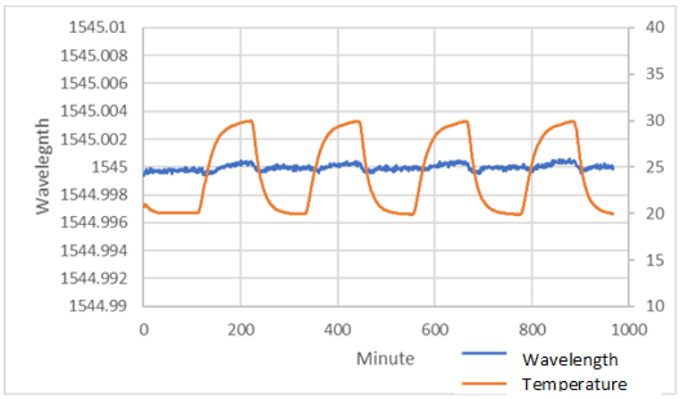 環境溫度(dù)在10°C範圍內循環時,範圍內任何位置的一般波長的(de)波長與時間的關係。總漂(piāo)移小於1pm。ClarityPlus可(kě)以為C波段的任何波長生成可(kě)追溯到NIST的波長。
