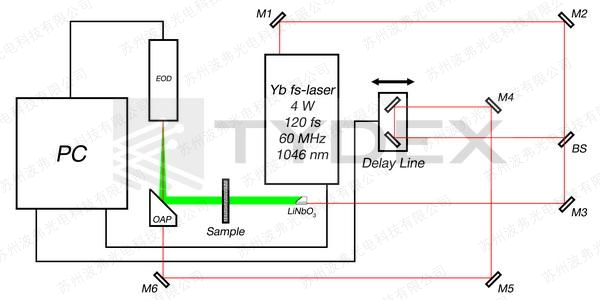 泵浦光束聚焦到(dào)生成結構中(zhōng)。來自生成結構的太赫茲(zī)輻射輸(shū)出被引導至包含所研究樣品(pǐn)的單元。 通過細胞後,太赫茲輻射被聚(jù)焦到EOD的電光晶體中。
