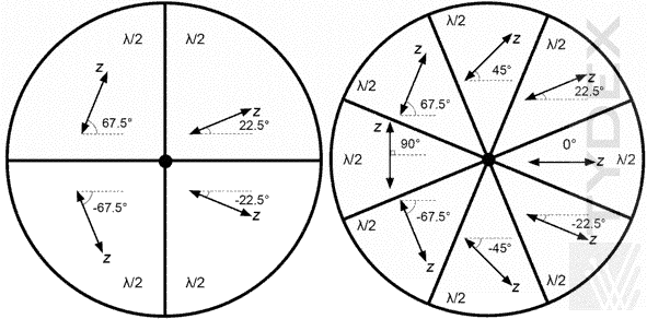 由幾個特殊定向的(de)半波片組成的分段(duàn)波片允許從線性偏振的輻射獲得徑向和方位角偏振的輻射。 這種(zhǒng)波片的工作原理如下所示。