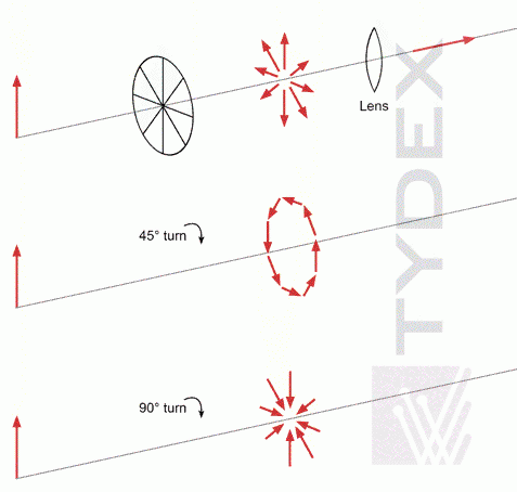 通(tōng)過將分段波片旋轉 45 度,可以將徑向偏振變為方(fāng)位角偏振。 通過(guò)將(jiāng)波片旋轉 90 度,徑(jìng)向偏(piān)振方向(xiàng)變為相反的方向。 分段波片與正透鏡的組合(hé)使輻(fú)射沿其傳播方向偏振。