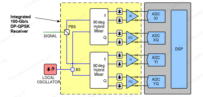 集成的100-Gb/s DP-QPSK接(jiē)收器將兩個90°光混合器(qì)與四對平衡光電探測器(PD)和四個線性TIA集成(chéng)到(dào)單個(gè)蝶形封裝中(zhōng)。 與其他不包含偏(piān)振分(fèn)束器(PBS)和/或功率分束器(BS)的技術不同,Optoplex的接(jiē)收器包含這(zhè)兩種技(jì)術以(yǐ)及光混合器、PD和TIA,以(yǐ)提供完全集成的解決方案,這將使用戶受(shòu)益 在完全消除光纖路由和傾斜管(guǎn)理方麵。 集成接收器以高達32GBaud/s的波特率工作。