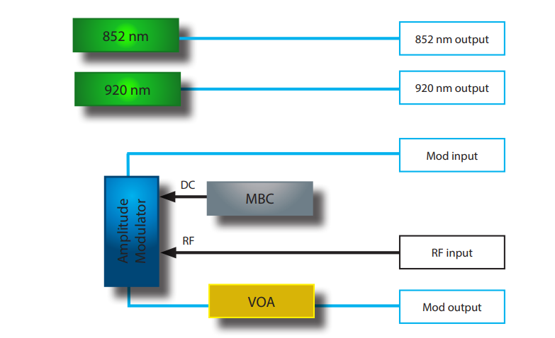 • 內嵌(qiàn)兩個激光源,一個(gè)852 nm和920 nm低RIN DBR激光器。為了便於使用,省略了一根外部(bù)接插線,將激光(guāng)輸出連接到調製器輸入光(guāng)端口。波長和功率可通過前麵板控製或ModBox軟件(jiàn)接口進行調(diào)整。